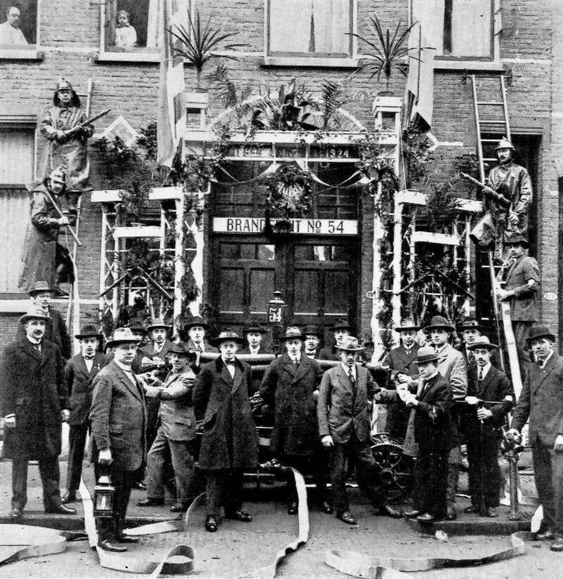 Een foto uit 1923, een zogenaamd tableau de la troupe, genomen voor het spuithuisje van Spuit 54 dat sinds 1917 in de Ackersdijkstraat gevestigd is. Het tafereel is gefotografeerd tijdens de huldiging van hoofdman Kruis, die 25 jaar actief is bij de Vrijwillige brandweer.