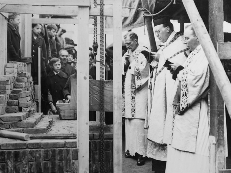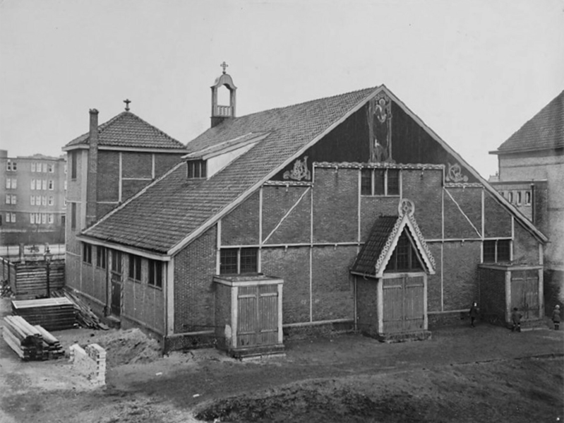 Op de eerste foto de houten noodkerk, met uiterst rechts de pastorie die in 1921 gebouwd is. Op de tweede foto de eerste steenlegging voor de definitieve Heilige Familiekerk op 23 februari 1926.
