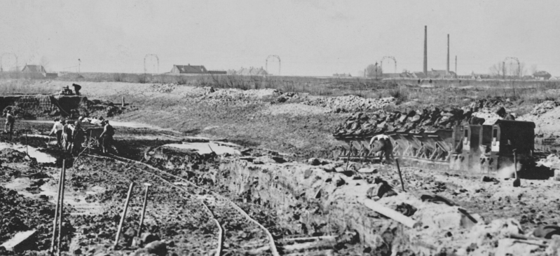 De graafwerkzaamheden voor de aanleg van het Noorderkanaal. Na 1933 zou dit een werkverschaffingsproject worden. Op de achtergrond de ceintuurspoorbaan.