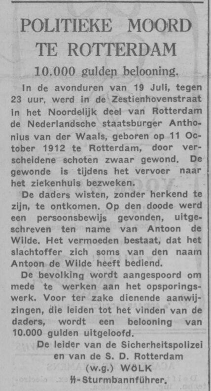 De agenten van het bureau Bergsingel weten niet goed wat ze ermee aan moeten, maar melden het incident aan de Rotterdamse SD-leider Wölk. Het Rotterdamse hoofd belt vervolgens met Schreieder in Den Haag die hem de opdracht geeft de volgende ochtend samen met de politie van het bureau aan de Bergsingel een onderzoek in te stellen. Op zoek naar mogelijke getuigen blijken in de Zestienhovenstraat inderdaad enkele bewoners te zijn die schoten gehoord hebben en twee mannen gezien hebben die een lichaam in een auto hebben gesleept. De Rotterdamse SD geeft deze informatie door aan Schreieder. Het gaat precies zoals was uitgedacht. Schreieder zorgt er daarna voor dat op 21 juli in alle Nederlandse kranten een bericht geplaatst wordt waarin een beloning wordt uitgeloofd van 10.000 gulden voor het vinden van de daders van de “politieke moord” op de Nederlandse staatsburger Anton van der Waals.